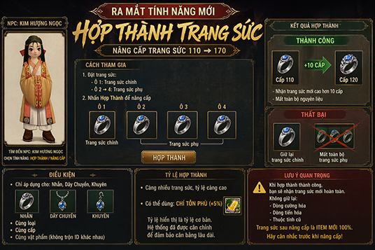 🔥 RA MẮT TÍNH NĂNG: HỢP THÀNH TRANG SỨC 🔥 Chính thức mở hệ thống nâng cấp Nhẫn – Khuyên – Dây Chuyền từ cấp 110 ➜ 170! 📌 CÁCH THAM GIA…